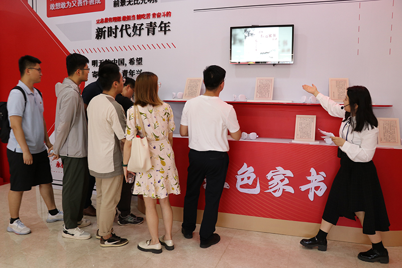 “紅色家書”互動墻前,一封封“紅色家書”通過數(shù)字智能互動技術(shù)播放,團員青年們駐足閱讀,認真聆聽,追憶革命先輩家國情懷,體悟感受信仰力量。