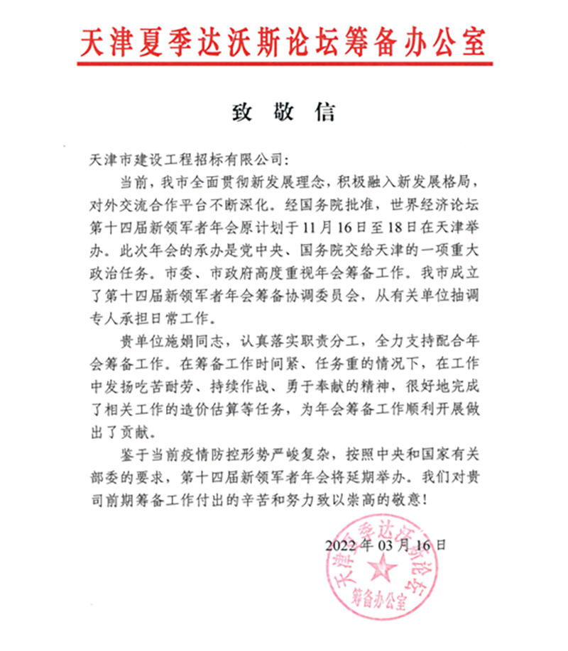 日前,天咨公司所屬招標(biāo)公司收到天津夏季達(dá)沃斯論壇籌備辦公室發(fā)來的致敬信,充分肯定了招標(biāo)公司為天津夏季達(dá)沃斯論壇年會(huì)籌備工作所作的積極努力。