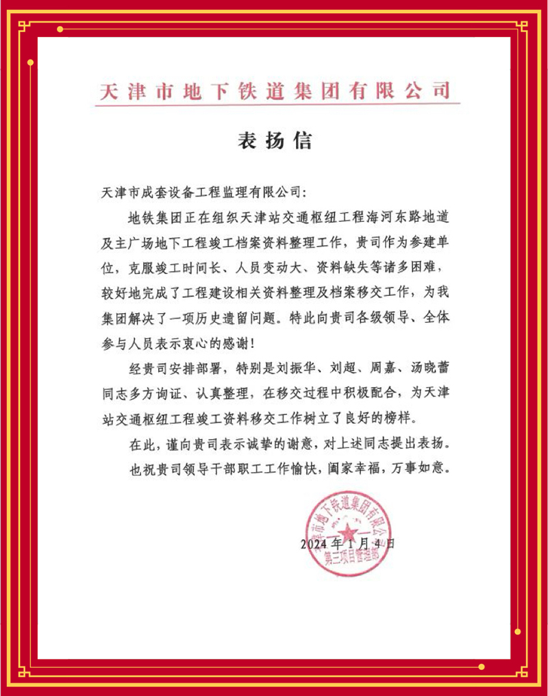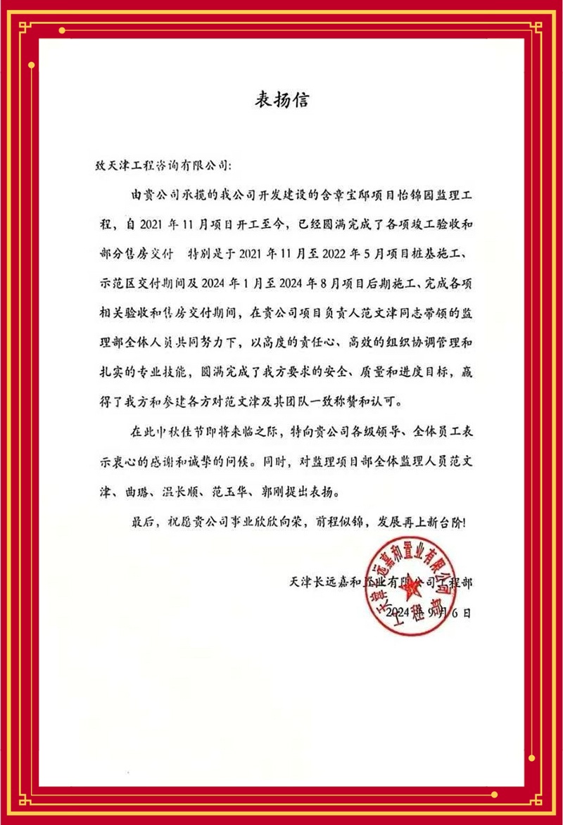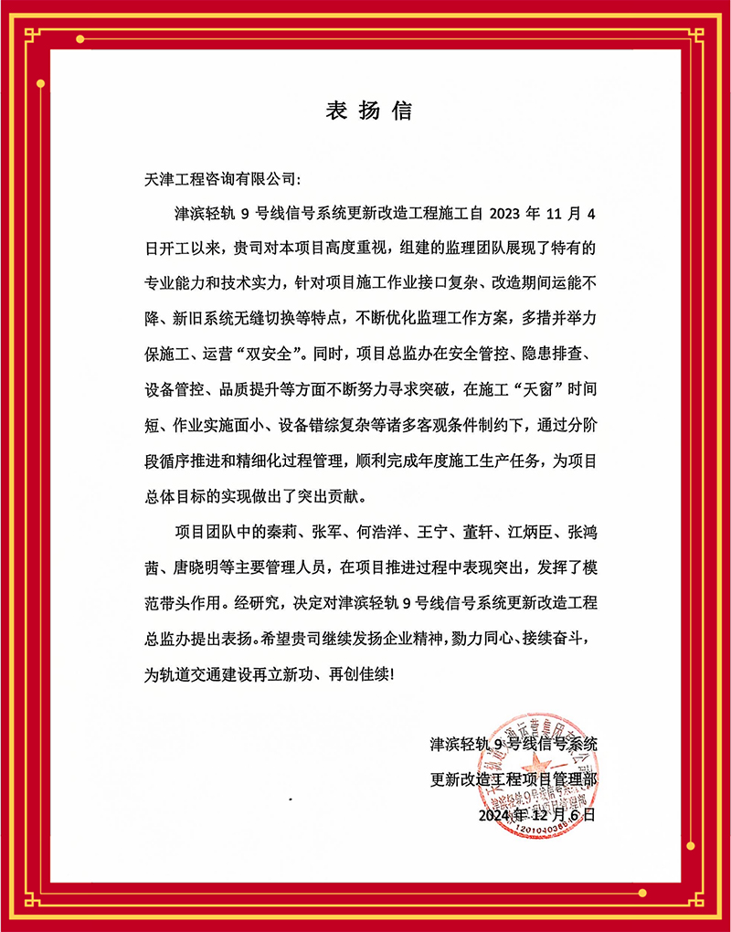 津?yàn)I輕軌9號(hào)線信號(hào)系統(tǒng)更新改造工程項(xiàng)目部感謝監(jiān)理團(tuán)隊(duì)多舉措解決項(xiàng)目施工作業(yè)接口復(fù)雜、改造期間運(yùn)能不降、新舊系統(tǒng)無(wú)縫切換等難題,力保施工、運(yùn)營(yíng)“雙安全”;天津長(zhǎng)遠(yuǎn)嘉和置業(yè)有限公司贊賞含璋寶坻項(xiàng)目怡錦園項(xiàng)目監(jiān)理團(tuán)隊(duì)以高度的責(zé)任心、高效的組織協(xié)調(diào)管理和扎實(shí)的專業(yè)技能推動(dòng)項(xiàng)目圓滿完成;天津華勘穂金房地產(chǎn)開發(fā)有限公司感謝監(jiān)理項(xiàng)目部主動(dòng)對(duì)接業(yè)主需求,有效管控質(zhì)量安全,切實(shí)保障施工進(jìn)度,很好地履行監(jiān)理職責(zé)......