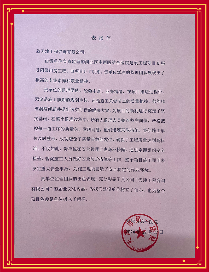 2024年,為持續(xù)深化“1264”戰(zhàn)略體系特別是“六化”舉措,加快推進(jìn)實(shí)體化進(jìn)程,天津咨詢順利完成吸收合并下屬成套監(jiān)理公司,在持續(xù)打造天津咨詢品牌,以工程監(jiān)理和項(xiàng)目管理為基礎(chǔ),發(fā)揮在項(xiàng)目建設(shè)期的綜合專業(yè)優(yōu)勢(shì),逐步形成“監(jiān)”“管”一體化服務(wù)模式方面邁出關(guān)鍵一步。近期,多家業(yè)主單位先后發(fā)來(lái)感謝信、表?yè)P(yáng)信,對(duì)天津咨詢承擔(dān)工程建設(shè)監(jiān)理任務(wù)給予充分肯定。