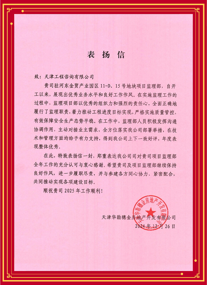 感恩客戶 再接再厲——天津咨詢承擔(dān)工程建設(shè)監(jiān)理項(xiàng)目獲業(yè)主好評(píng)